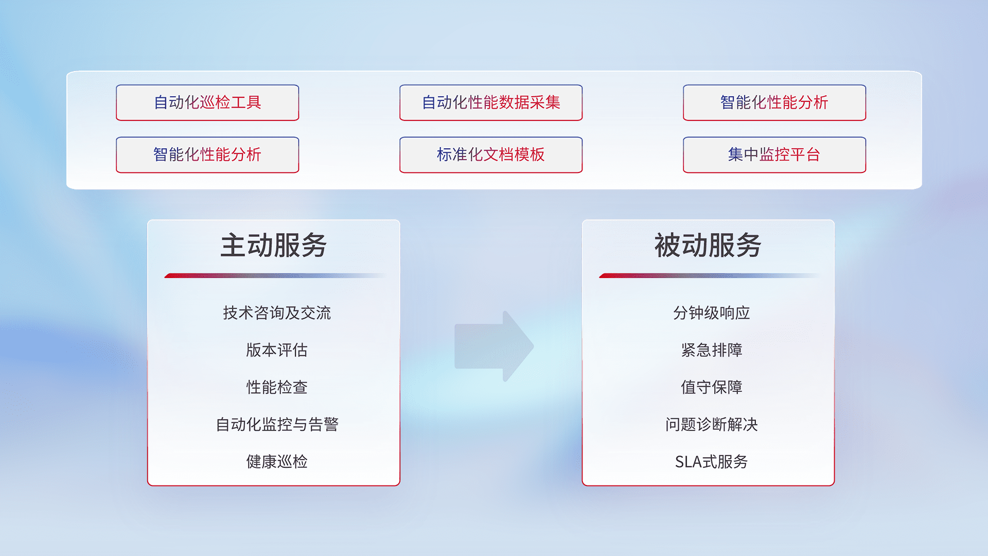 智能化工具和标准化文档,,保障服务质量,,提供主动服务(包含技术咨询、、版本评估、、、性能检查、、、自动化监控与告警、、、、健康巡检)和被动服务包含(分钟级响应、、紧急排障、、、值守保障、、问题诊断解决、、、SLA服务)。。。。